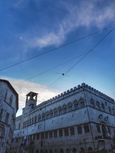Andrea Loreni walks over a steel rope, 40 metres above Piazza IV Novembre, to cover the 110 metres separating Palazzo dei Priori from San Lorenzo Cathedral.